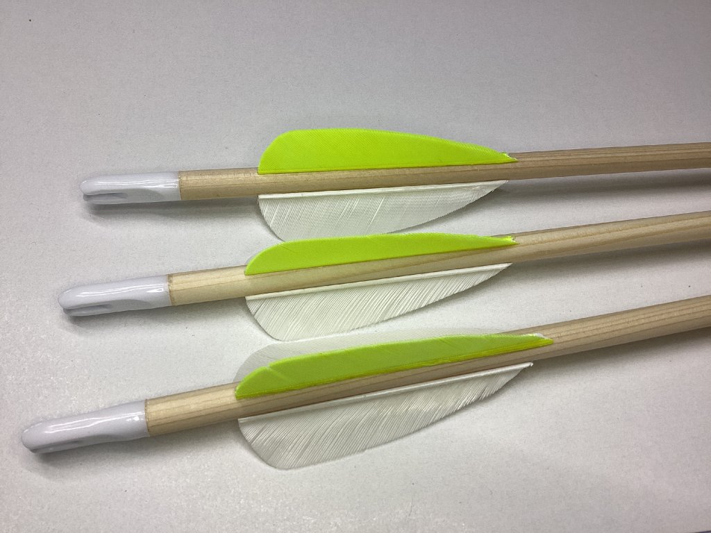 Šíp s dřevěným dříkem, letkami z krocaního peří, plastovým končíkem a kovovým terčovým hrotem 70 gn. Tvrdost šípu pro požití ve slabších lucích do 25 liber. Délka šípu 28”, na objednávku do 32”.